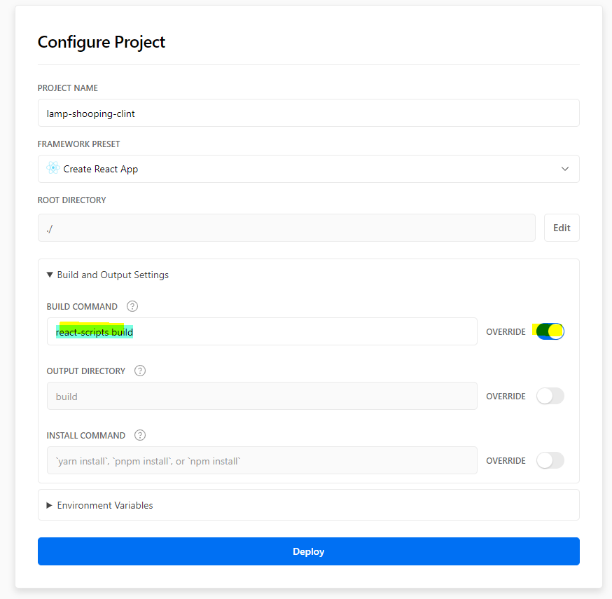 그냥 올려서 배포가 안된다면(40초? 쯤 에러나던데..), BUILD COMMAND의 내용을 수정해주면된다.