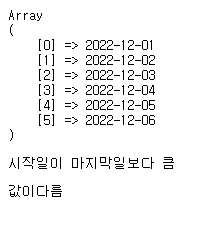 - 시작일과 마지막일 사이의 날짜가 있는지 비교한다. ( 2일밑이면 원레 그냥 배열로 2개만 리턴했는데 보기편하라고..)