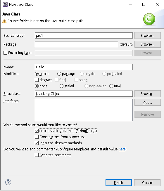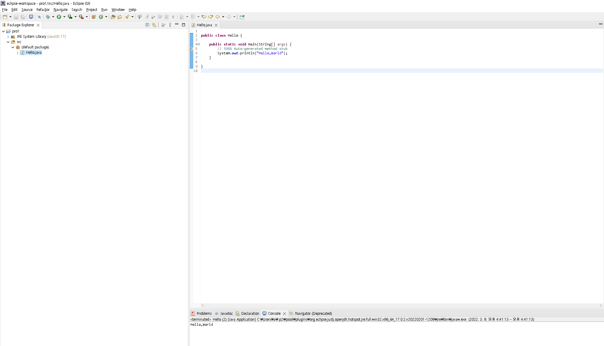 동작을 시켜보면 class를 만들어 실행시킴으로서 실행화면이 표시 되야하는데 이클립스에선 클래스 파일이