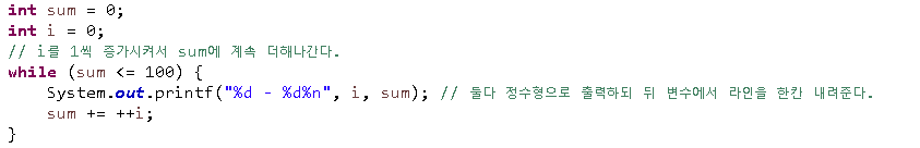 // 조건식의 연산결과가 참일때 수행될 문장들을 적는다.( 1번은 먼저 수행된 후 조건을 확인한다)