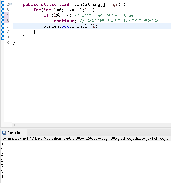 자신이 포함된 반복문의 끝으로 이동 - 다음 반복으로 넘어감