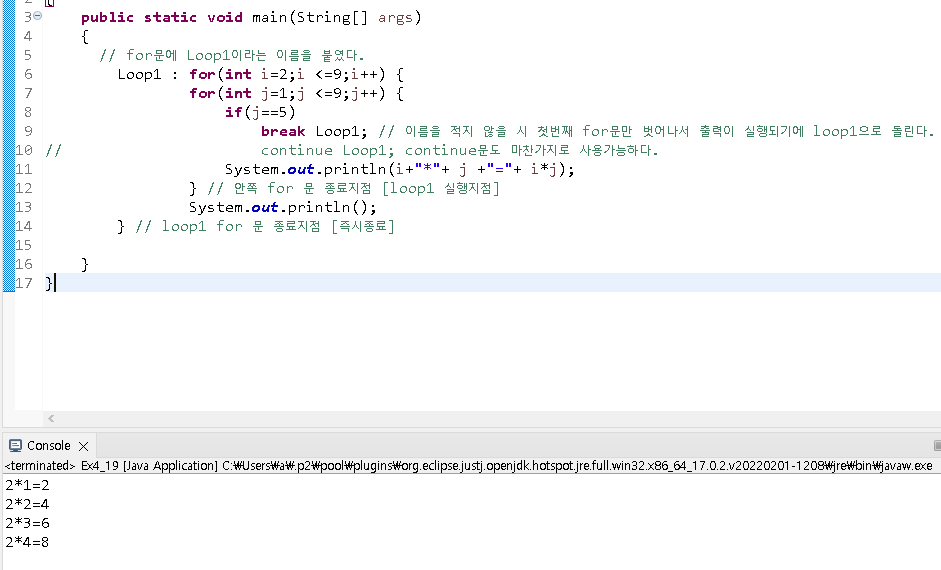 break loop1; 의 경우 맨위에 있는 for문이기에 실행되면 바로 프로그램이 종료된다.