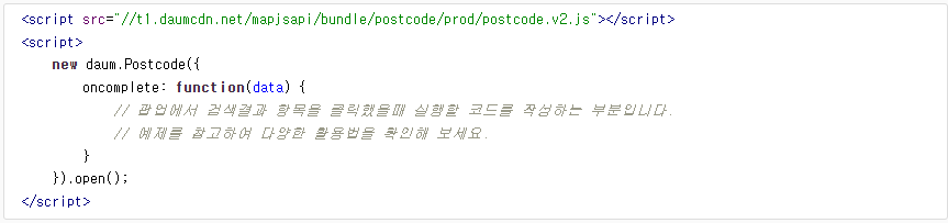 방법은 1. https://postcode.map.daum.net/guide 애초에 지원을 해주기에 그대로 사용하면 된다.